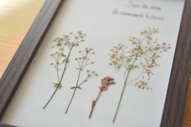 Information : Sur ce tableau sont présentes de véritables plantes sauvages, récoltées de manière raisonnée en Isère (38) et séchées avec soin dans une presse en bois. Le temps de séchage des plantes est d’un mois au minimum.