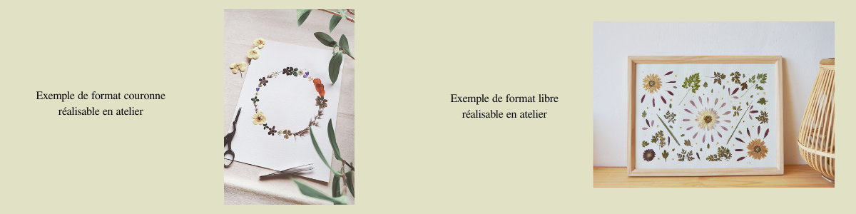 Vous vous laisserez guider par les plantes pour la création de votre herbier, qui pourra être en format libre ou en format couronne selon l'intitulé de l'atelier prévu (voir photos ci-dessous pour exemples).